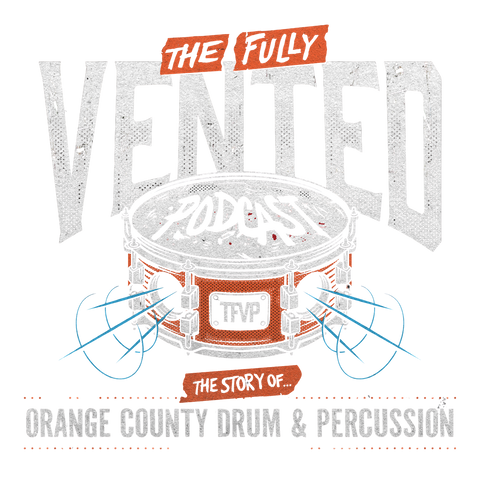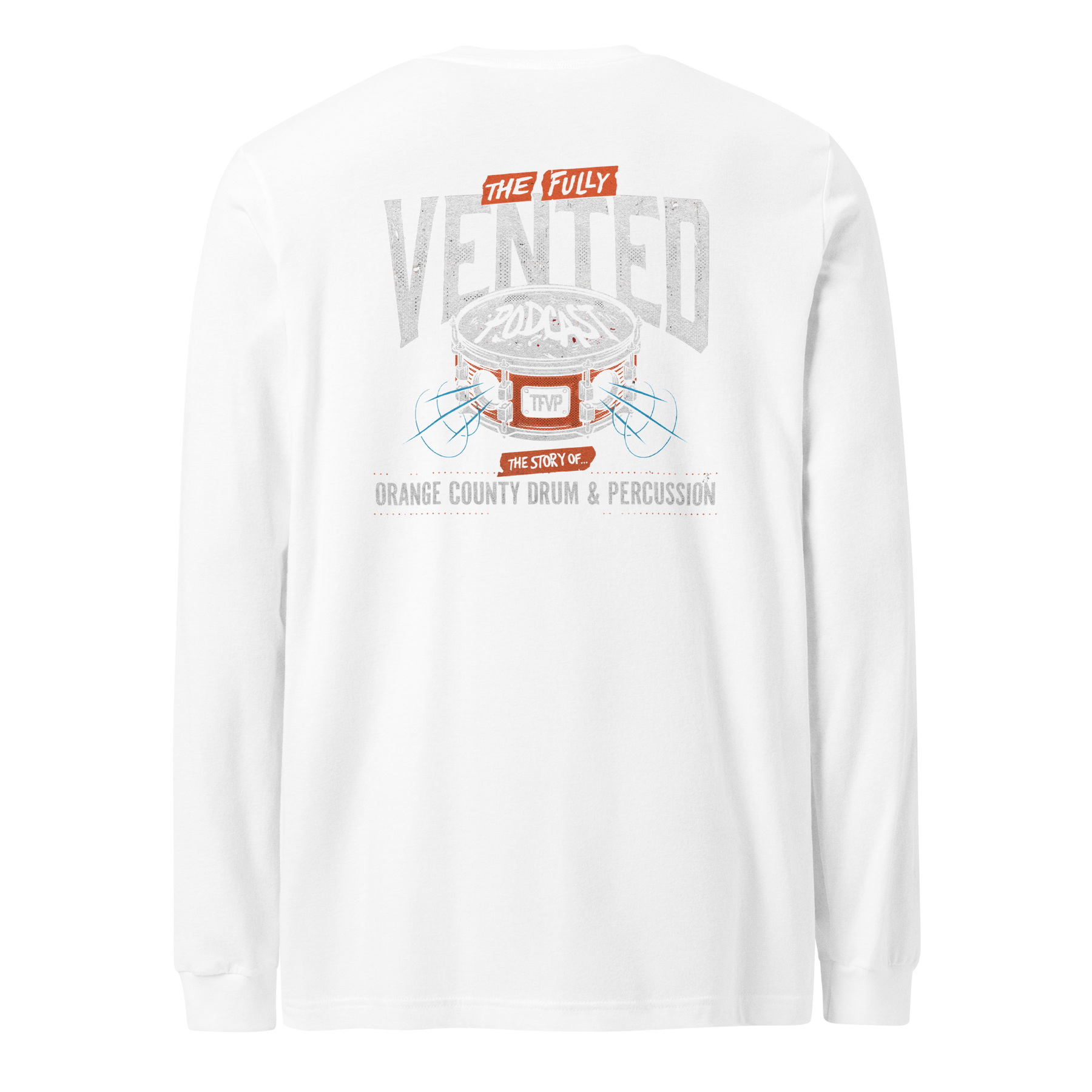 White long sleeve tee featuring drum artwork on front chest and "The Fully Vented" logo on back.